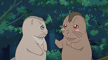 アニメーション。雨が晴れ上がり、虹の根っこを突きとめようとする少年ユヅキ。迷った森でヤマネの姿になってしまう。そこには車が行き交う道