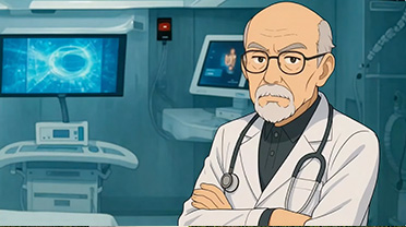 AIによるアニメーション。ベテラン外科医は、癌と診断された高齢の患者に、若い看護師たちを諭しつつ、果たして手術をすべきかどうかの葛藤