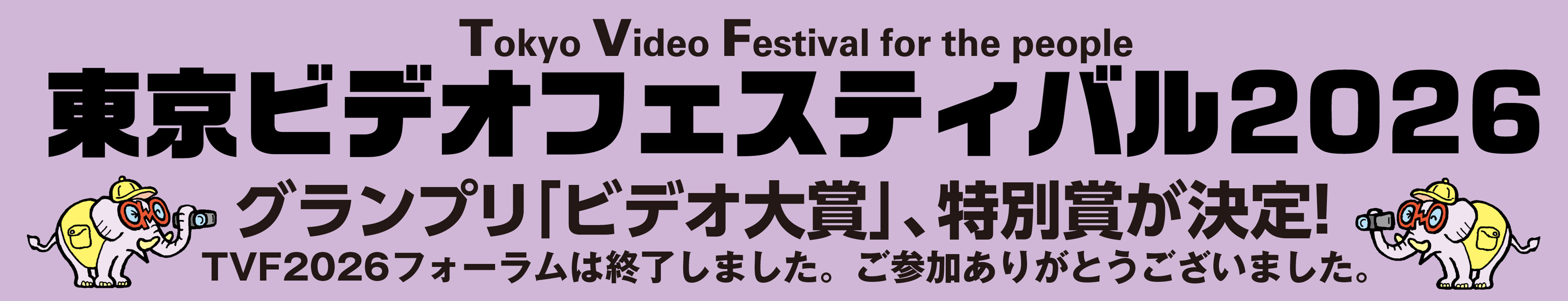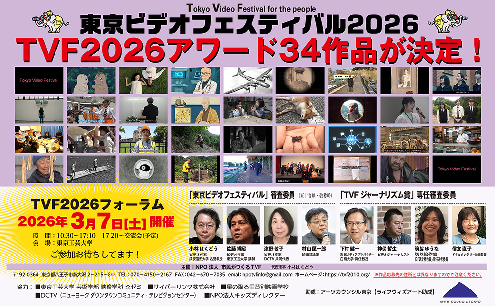 入賞作品として「TVF2026アワード」(34作品)を決定! プレスリリース 2025年12月1日(月) 作品応募を締め切りました。ご応募ありがとうございました。入賞作品は当ホームページで2026年1月中旬に発表予定です。 2025年9月14日 (日) 2025年度 ライフウィズアート助成対象事業に決定! 公益財団法人東京都歴史文化財団 アーツカウンシル東京が実施する「ライフウィズアート助成」の対象事業として「東京ビデオフェスティバル2026」が採択されました。対象事業として、 パンフレットやチラシ、ウェブサイト等で助成クレジット及びロゴを掲載していきます。詳しくは、アーツカウンシル東京の公表をご覧ください。 こちら TVF2026 応募作品Web公開開始しました。 2025年8月21日(木) 「今こそもう一度見ようこの作品!(Remember this video again!)」 今回は猛暑をモチーフにしたユーモアある作品です。笑で暑さを吹き飛ばせ! 2025年8月3日(日) 新コーナースタート! 「今こそもう一度見ようこの作品!(Remember this video again!)」 TVFのこれまでの作品の中から今もう一度見て欲しい作品を紹介します。 今回は今日本中で話題になっている熊の出没について過去の歴史から学べる一作です。 2025年6月15日(日) 東京ビデオフェティバル(TVF)2026の作 品募集を開始しまし た!!