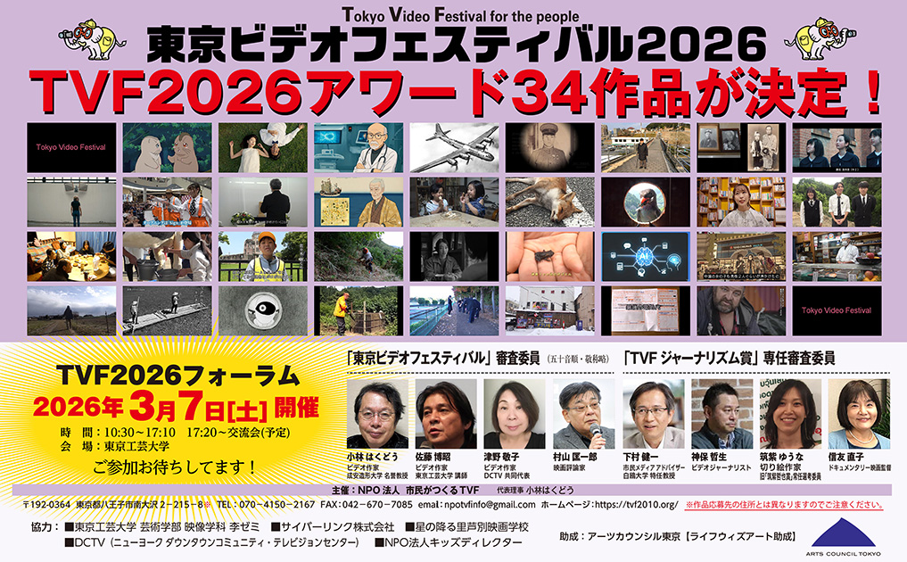 2026年1月17日(土) 入賞作品として「TVF2026アワード」(34作品)を決定! プレスリリース 2025年12月1日(月) 作品応募を締め切りました。ご応募ありがとうございました。入賞作品は当ホームページで2026年1月中旬に発表予定です。 2025年9月14日 (日) 2025年度 ライフウィズアート助成対象事業に決定! 公益財団法人東京都歴史文化財団 アーツカウンシル東京が実施する「ライフウィズアート助成」の対象事業として「東京ビデオフェスティバル2026」が採択されました。対象事業として、 パンフレットやチラシ、ウェブサイト等で助成クレジット及びロゴを掲載していきます。詳しくは、アーツカウンシル東京の公表をご覧ください。 こちら TVF2026 応募作品Web公開開始しました。 2025年8月21日(木) 「今こそもう一度見ようこの作品!(Remember this video again!)」 今回は猛暑をモチーフにしたユーモアある作品です。笑で暑さを吹き飛ばせ! 2025年8月3日(日) 新コーナースタート! 「今こそもう一度見ようこの作品!(Remember this video again!)」 TVFのこれまでの作品の中から今もう一度見て欲しい作品を紹介します。 今回は今日本中で話題になっている熊の出没について過去の歴史から学べる一作です。 2025年6月15日(日) 東京ビデオフェティバル(TVF)2026の作 品募集を開始しまし た!!